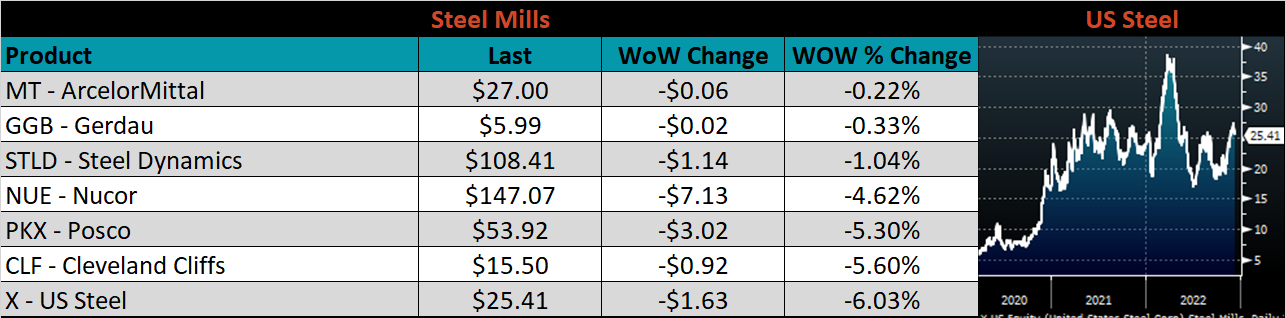 The CME Midwest HRC futures curve is below, with last Friday’s settlements in white. The front of the curve was higher this week, while 2Q23 and beyond are flat around $770.