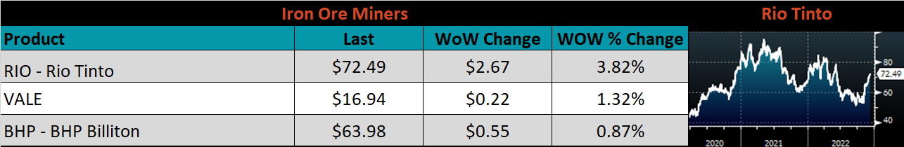 Below is the iron ore future curve with Friday’s settlements in orange, and the prior week’s settlements in green. Iron ore continues to rip higher with prices shifting $5-6 higher at all expirations last week.