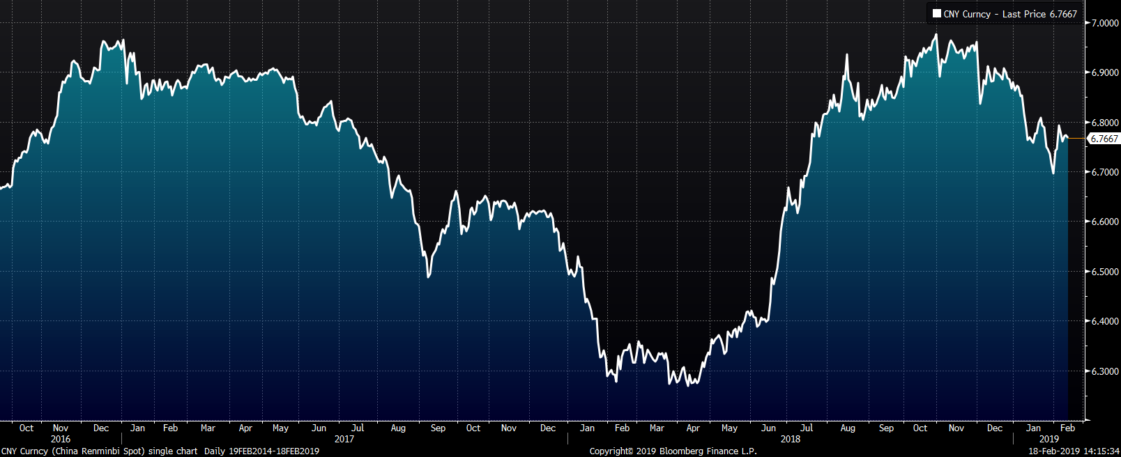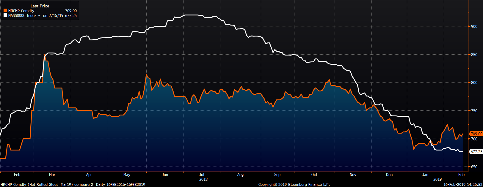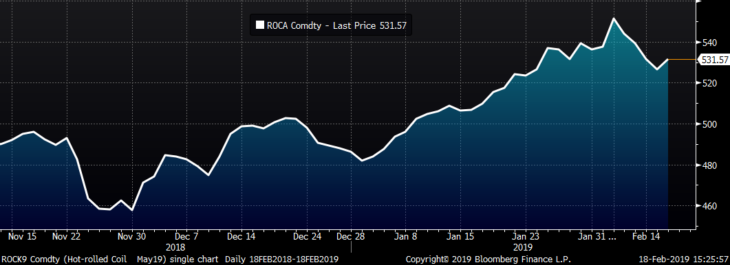 China’s return from the Chinese New Year holiday failed to produce any follow through in iron ore, which was down heavily on the week. Nevertheless, at $85/t, iron ore remains at very strong levels. Scrap prices followed iron ore lower. Trade talks between the U.S. and China continue without any concrete results. However, the Chinese yuan has appreciated in recent weeks perhaps indicating China’s expectation of a resolution or at the very least a delay to the March 1 deadline for another tariff increase.