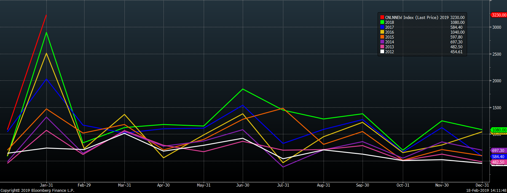 February flat rolled import licenses are forecast to fall 62k tons MoM to 717k while January flat rolled import licenses are forecast to fall 17k MoM tons to 779k.