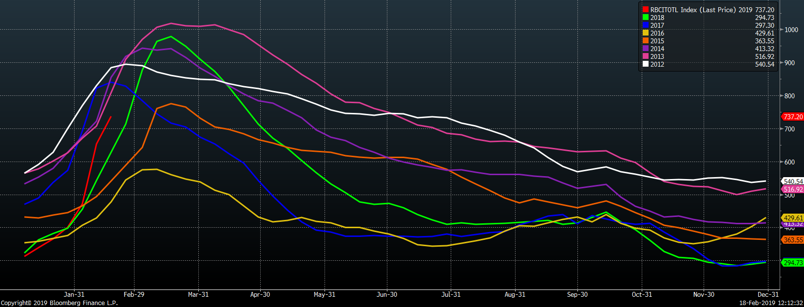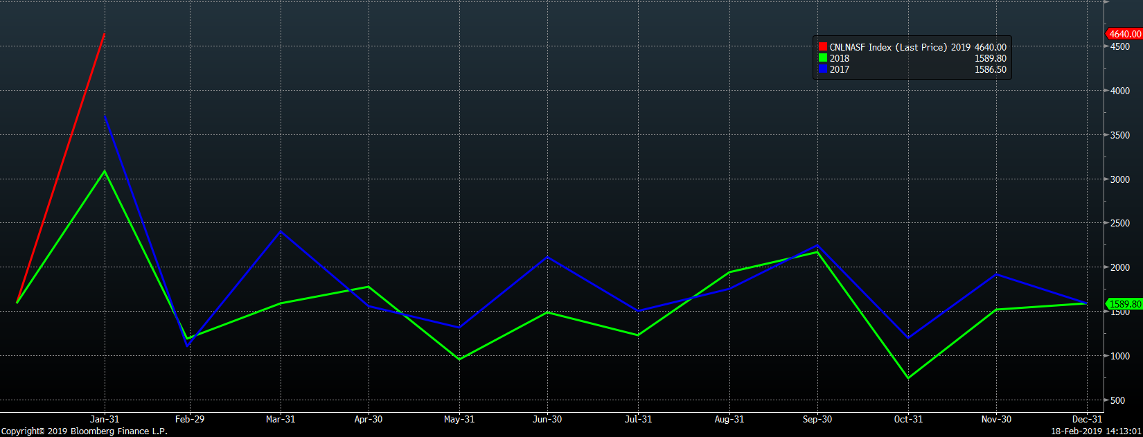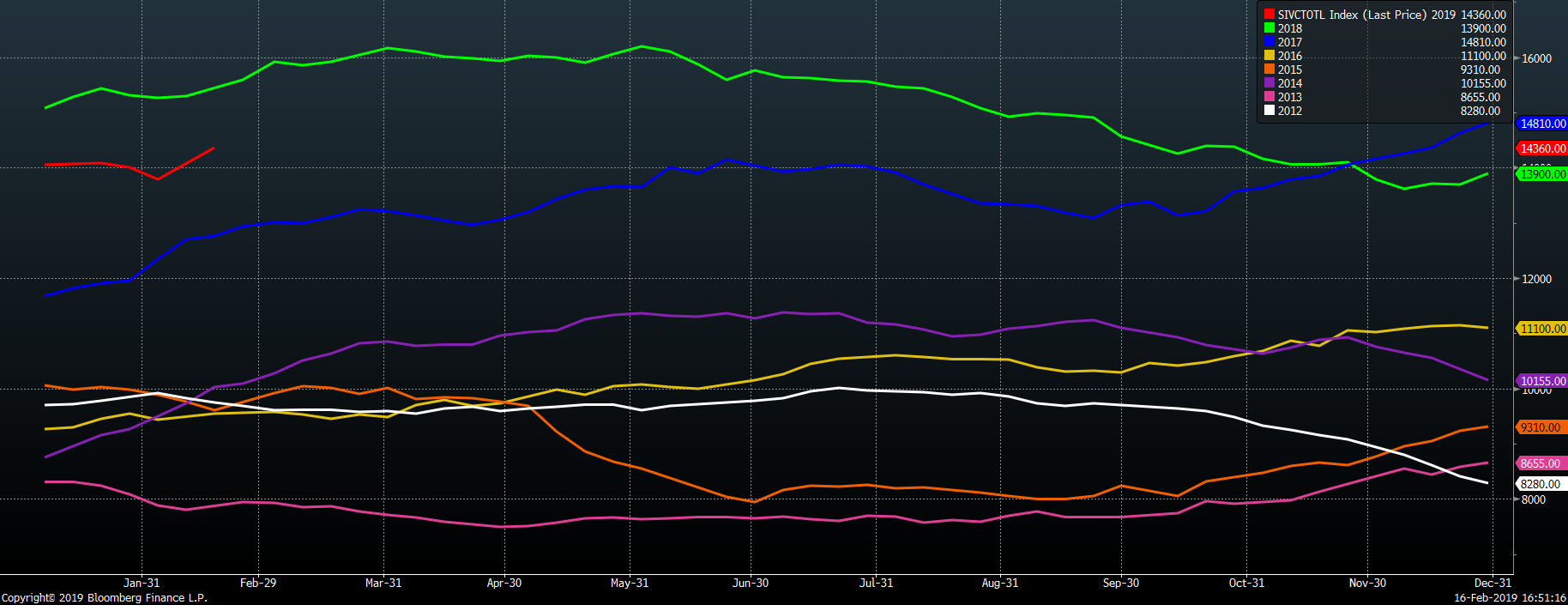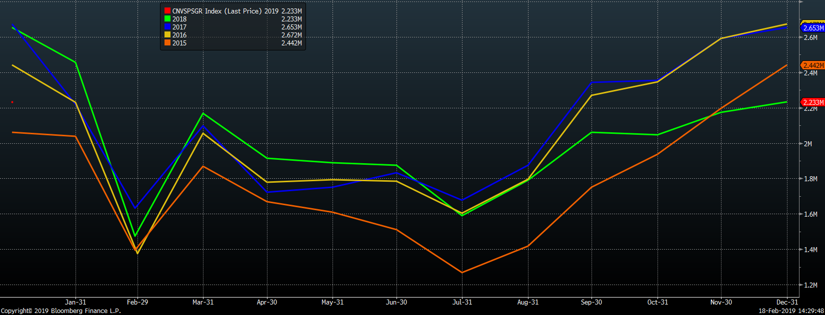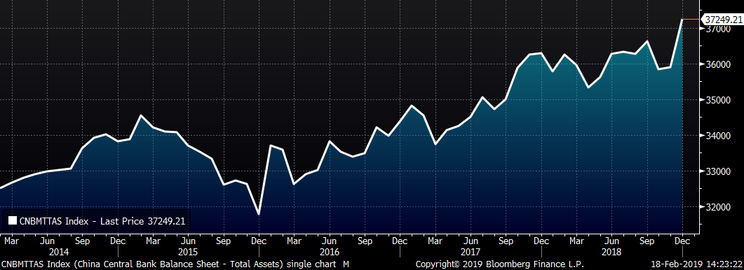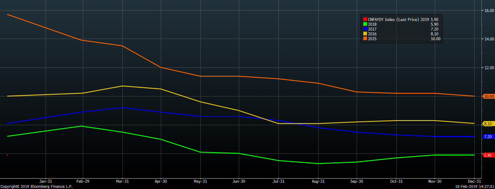 China has proactively fought the trade war induced drag on their economy on a number of fronts. Last week, January new yuan loans and aggregate financing data exceeded expectations as the P.B.O.C. continues to provide ample liquidity to the Chinese economy. Both charts compare monthly data on a YoY basis. 2019 data is in red.