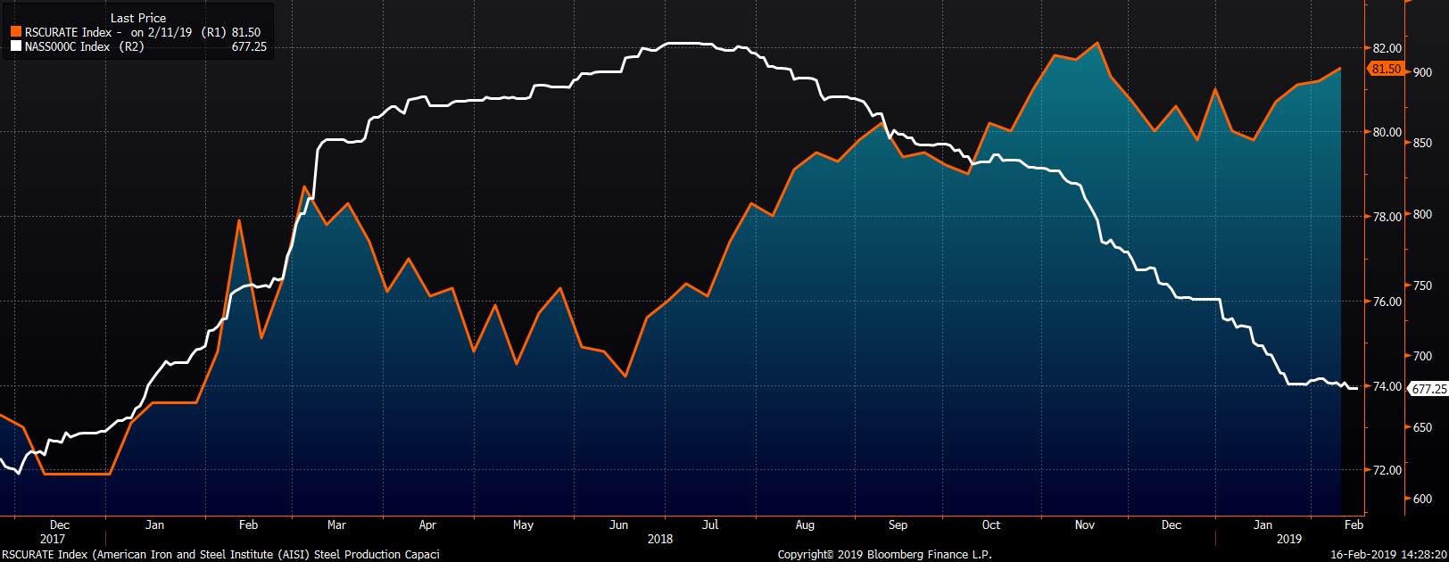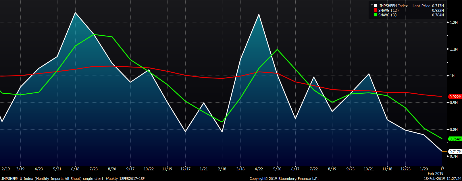 The MSCI reports January service center shipments and inventory this week. Typically, months-on-hand falls sharply in January due to rebounding shipments. One caveat is the last two days of January were hit with the polar vortex, which may have slowed shipments. Inventory changes in January are less black and white than shipments. Service centers struggled through the second half of 2018 taking in higher priced steel in a rapidly falling price environment. Most continued to be in a destocking mood in January with some in jeopardy of breaching covenants with their financiers. Service center destocking increased the pressure on domestic mills order books, which might be on the rebound in February as service centers look to max out volume on index-based deals, especially those deals discounted to the index. Keep an eye on lead times to see how much of an effect this has in this new environment of increased capacity. Recent economic data indicates steel demand has been slowing. In addition, steel buyers have been very price sensitive.