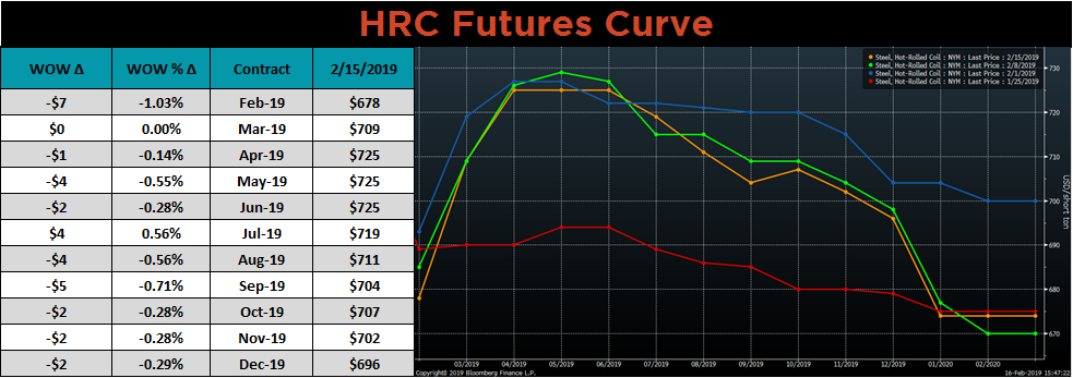 The CME Midwest HRC futures curve shown below with last Friday’s settlements in orange.