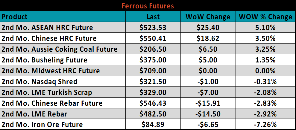 March ferrous futures are listed below. Iron Ore lost 7.3%, while Asian HRC futures rallied.