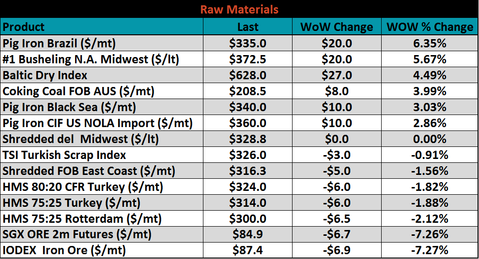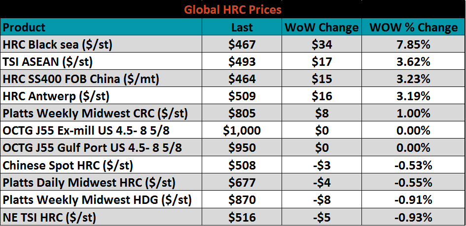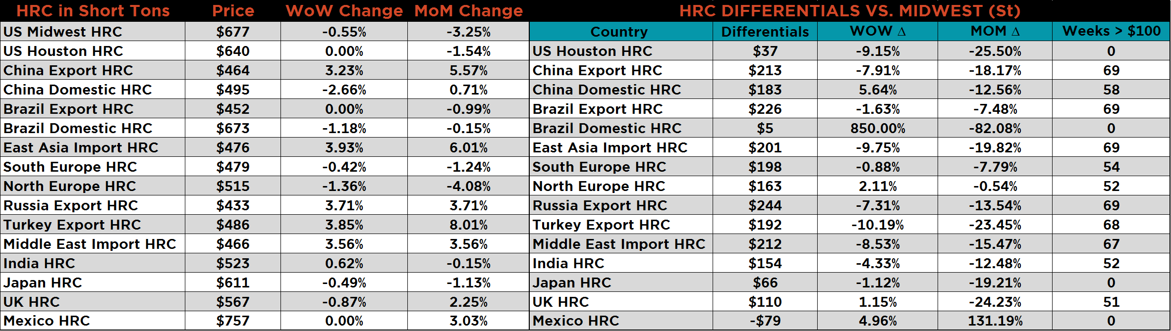 SBB Platt’s HRC, CRC and HDG WoW pricing is below. Midwest HRC moved to new recent lows, CR gained 1% and HDG dropped by 1%. Chinese, Russian and Turkish HR export prices saw nice gains while East Asian HR Import gained almost 4%. Chinese and Russian CR and HDG in Southern Europe also saw gains.