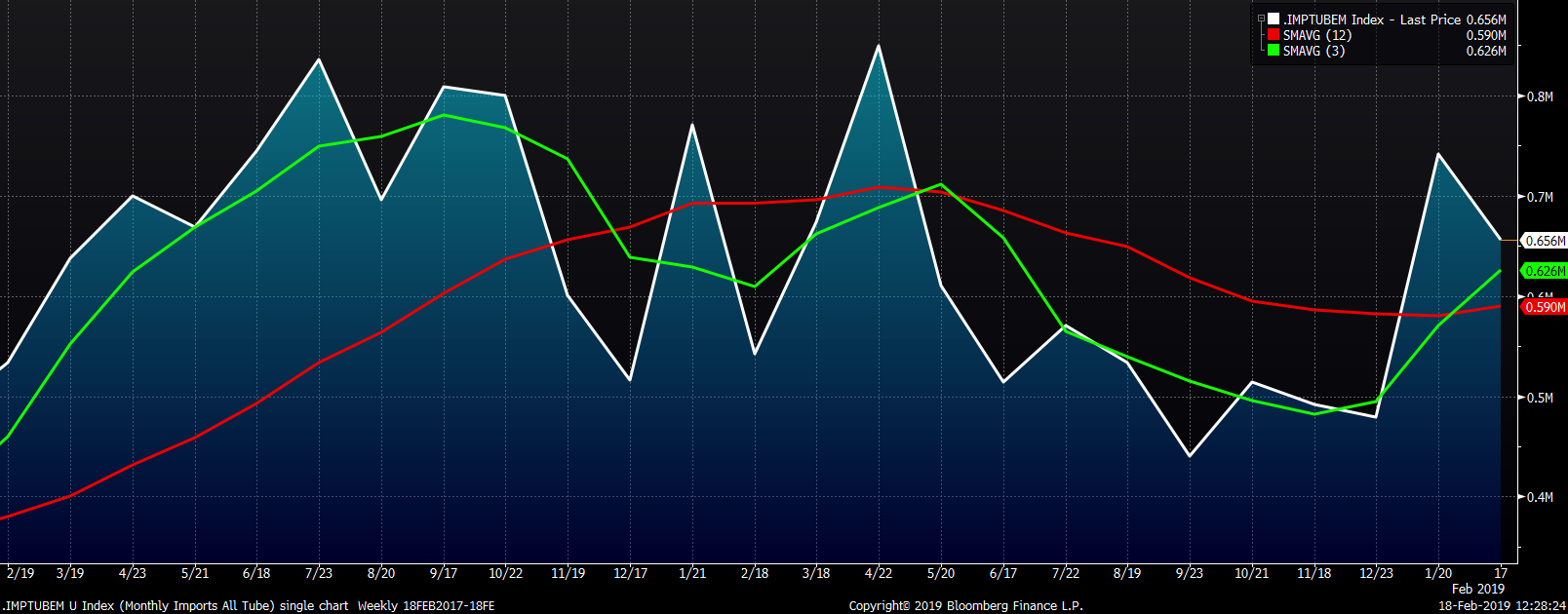 February tube import license data is forecasted to fall to 656k tons MoM.