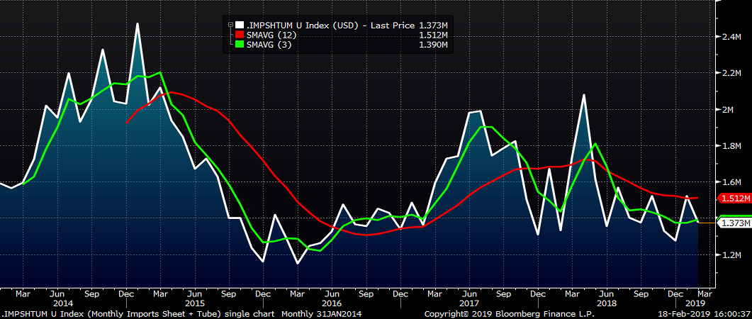 The combined flat and tube import license forecast looks to fall almost 150k tons in February after a 240k MoM increase forecast in January due to a big increase in tubular products, much of which was imported from Korea.