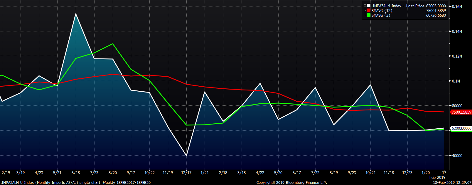 AZ/AL import licenses have become well entrenched around 60k with February licenses forecast at 62k. This would be the fourth consecutive month with galvalume imports around 60k.