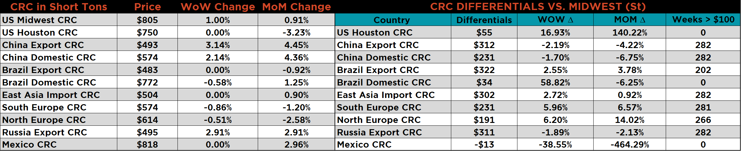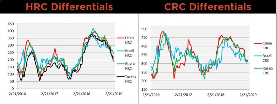 Below are HRC and CRC Midwest vs. each country’s export price differentials using pricing from SBB Platts. Import differentials continued to compress with Midwest HRC moving lower, while China, Russia and Turkish HR continued higher following led by the iron ore rally.