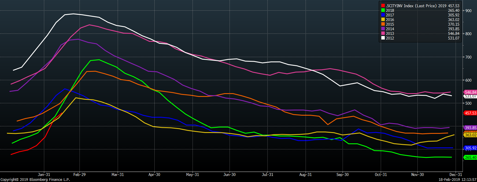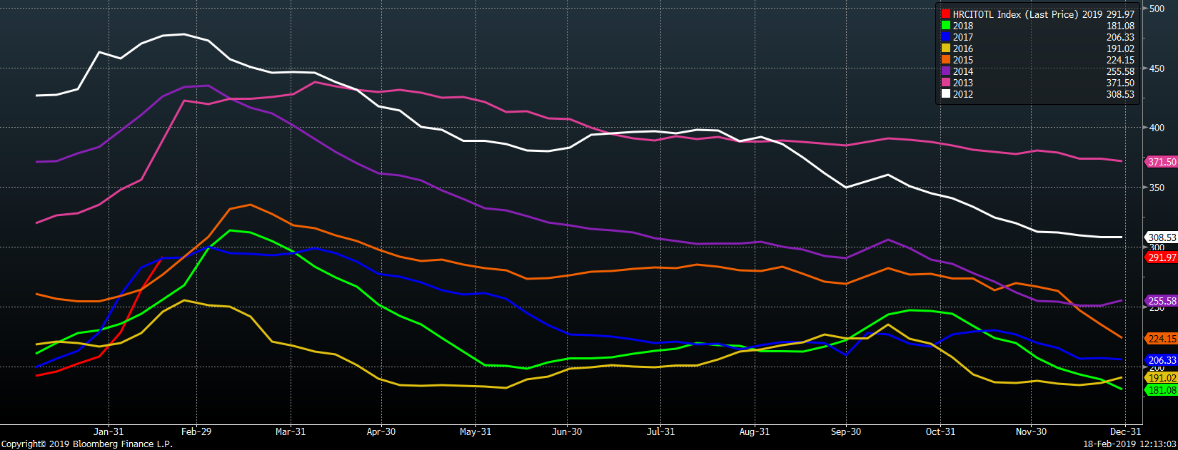 Chinese finished steel inventory levels (red) exceeded those seen this week in 2015, 2016 and 2018. 2019 HRC inventory is in line with this same week in 2018, while rebar inventory still trails the level it was at this week in 2018.