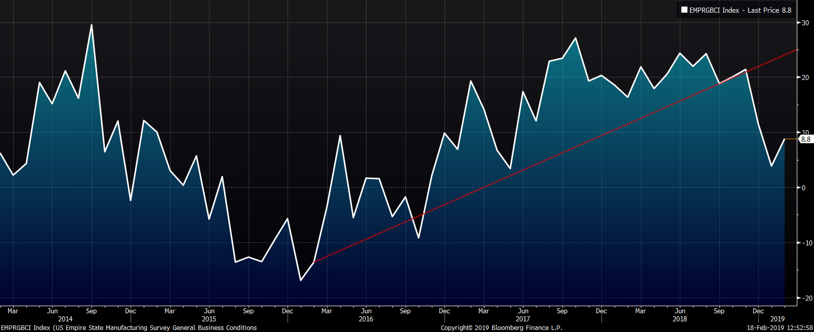 The February Empire Manufacturing Report rebounded adding 4.9 points to 8.8 and beat expectations.