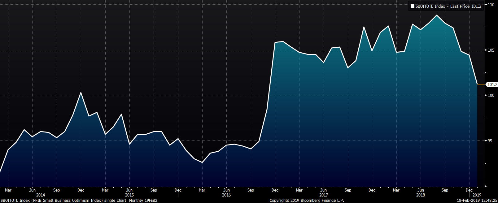 The January NFIB Small Business Optimism Index printed down 3.2 points to 101.2 missing expectations of 103.0. This is the lowest level the index has seen since November 2016.
