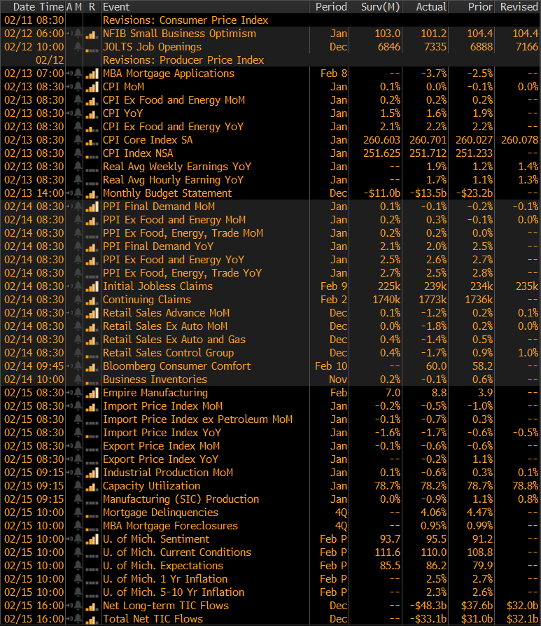 The rest of last week’s economic data is to the right. The January CPI Ex-Food and Energy rose 2.2% YoY, just ahead of expectations for a 2.1% YoY increase. The PPI Ex-Food and Energy increased 2.6% YoY, down from 2.7% in December, but higher than the 2.5% expectations. December retail sales all fell sharply and significantly missed expectations.