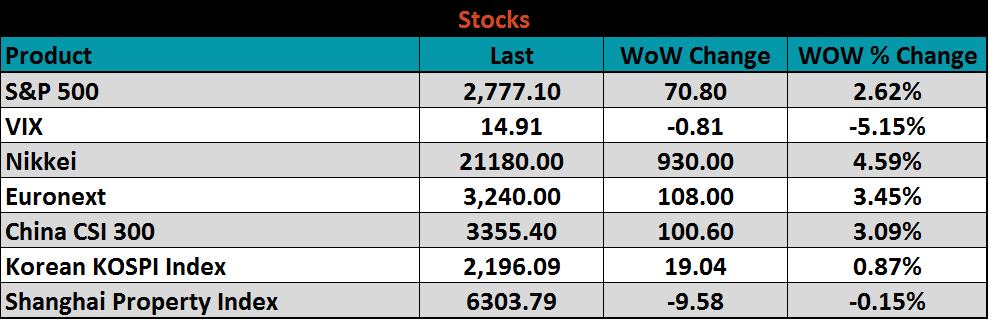The S&P 500 was up 2.6%. Stock markets in Europe, Japan and China saw solid gains in excess of 3% for the week.