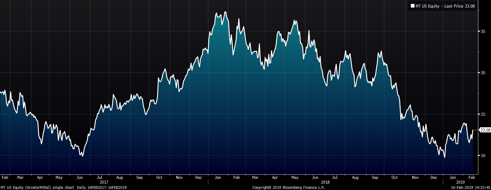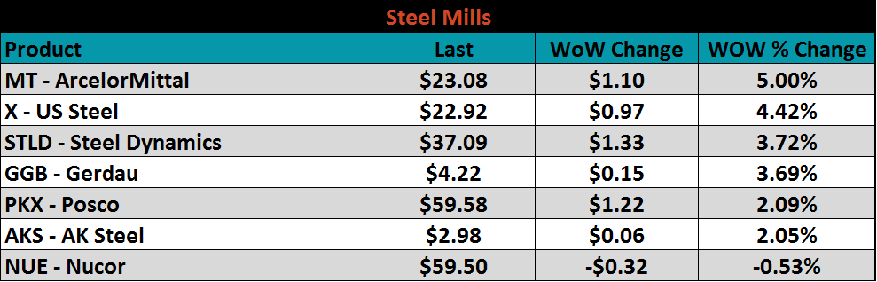 Steel mill stocks were mostly higher last week led by ArcelorMittal’s 5% gain.