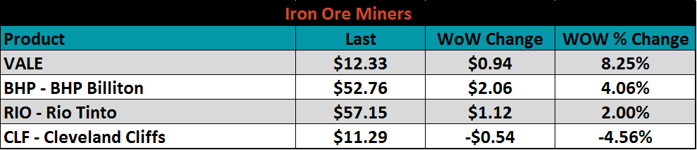 Mining’s stocks are listed below. Vale was up 8.3% bouncing back after multiple weeks of losses, while Cleveland Cliffs fell 4.6%.