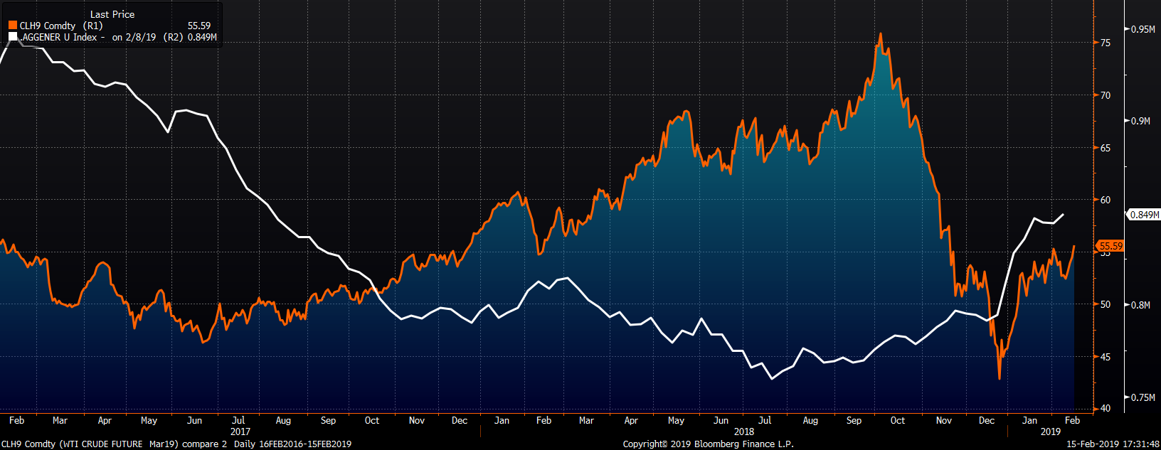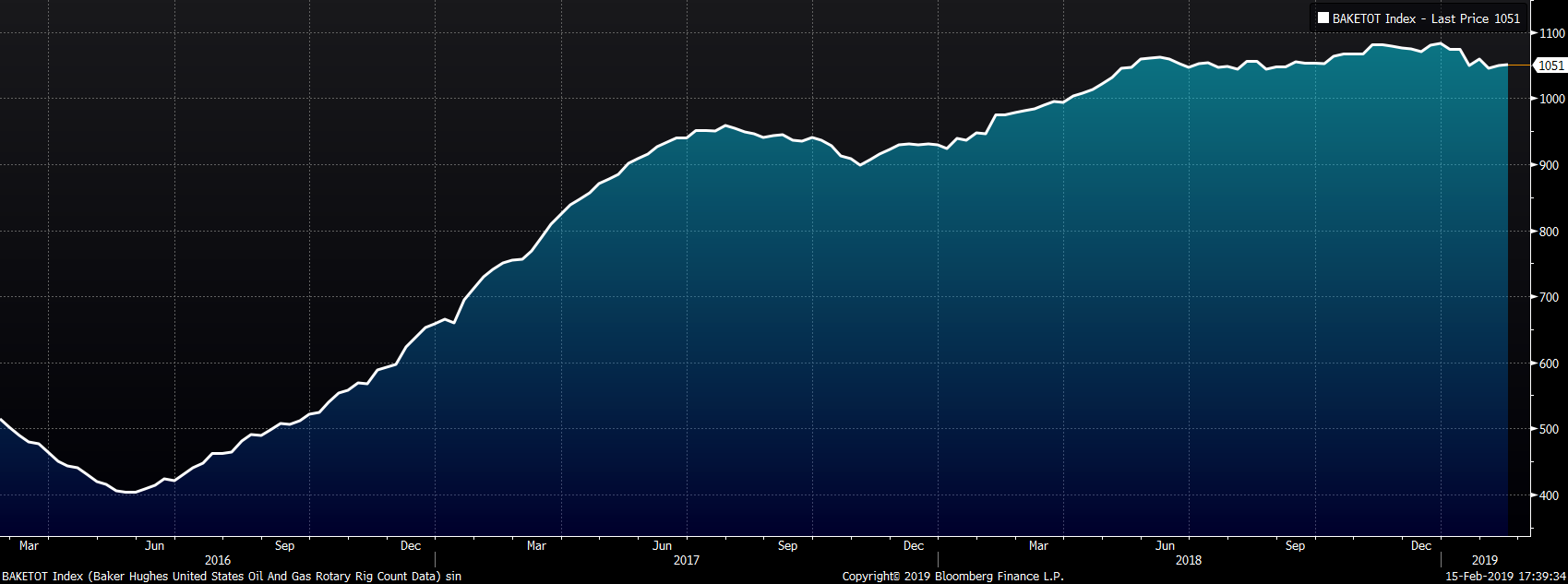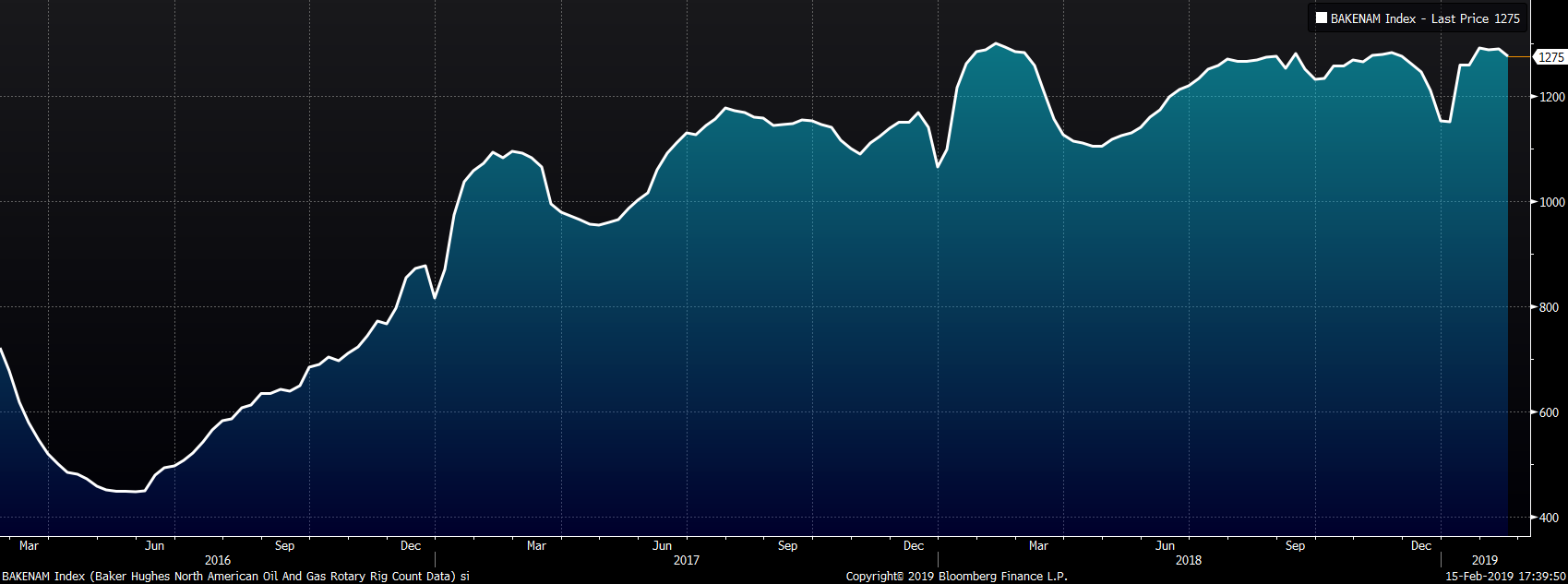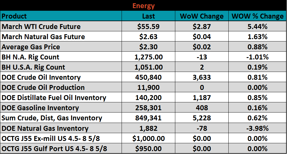 Last week, the March WTI crude oil future gained $2.87 or 5.4% to $55.59/bbl. Crude oil inventory was up 0.8% while distillate and gasoline inventories rose 0.9% and 0.2%, respectively. The aggregate inventory level rose 0.6%. Crude oil production remains at 11.9m bbl/day. The U.S. rig count added 2 rigs, while the North American rig count lost 13 rigs. The March natural gas future gained $0.04 or 1.6% to $2.63/mmBtu. Natural gas inventory fell 4%.