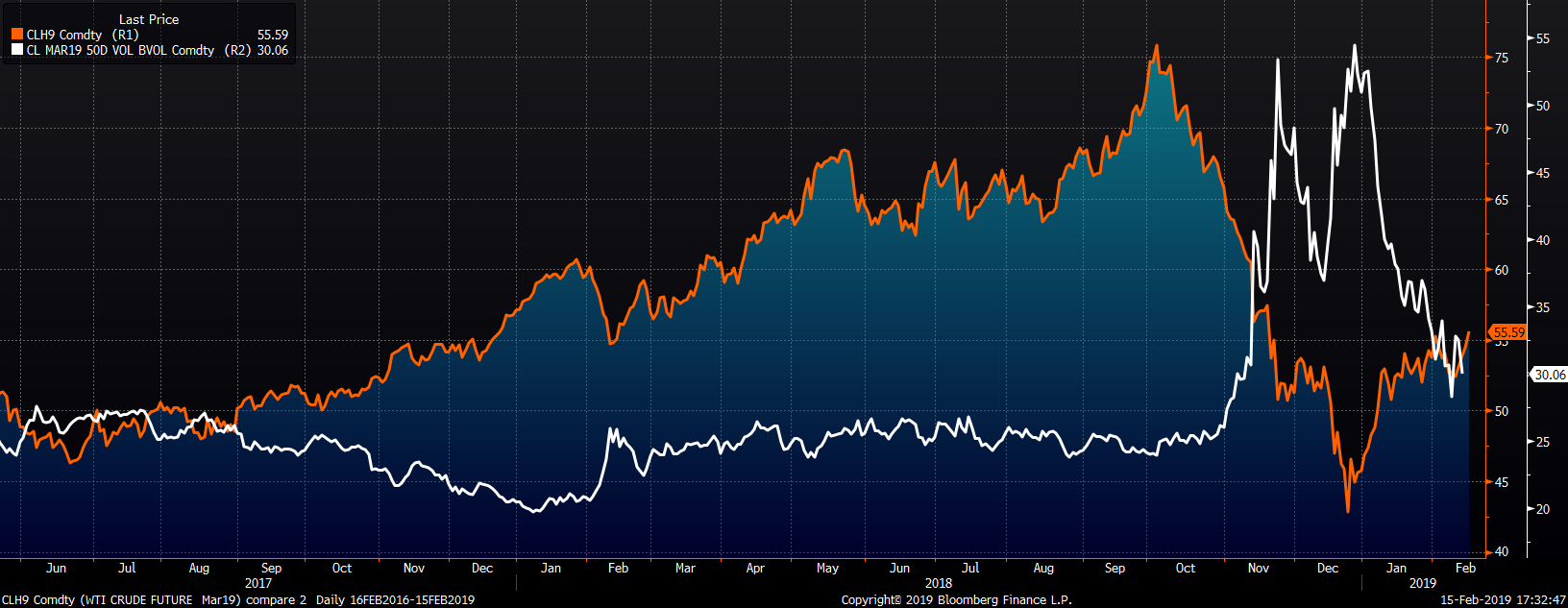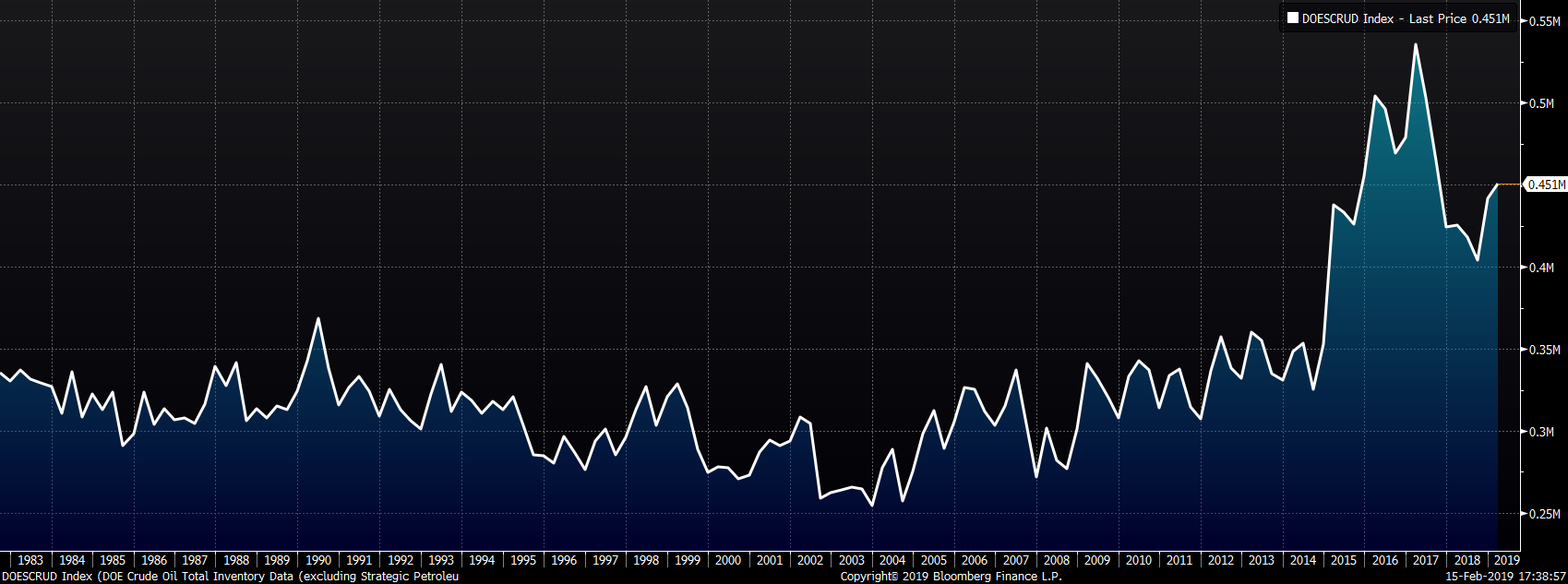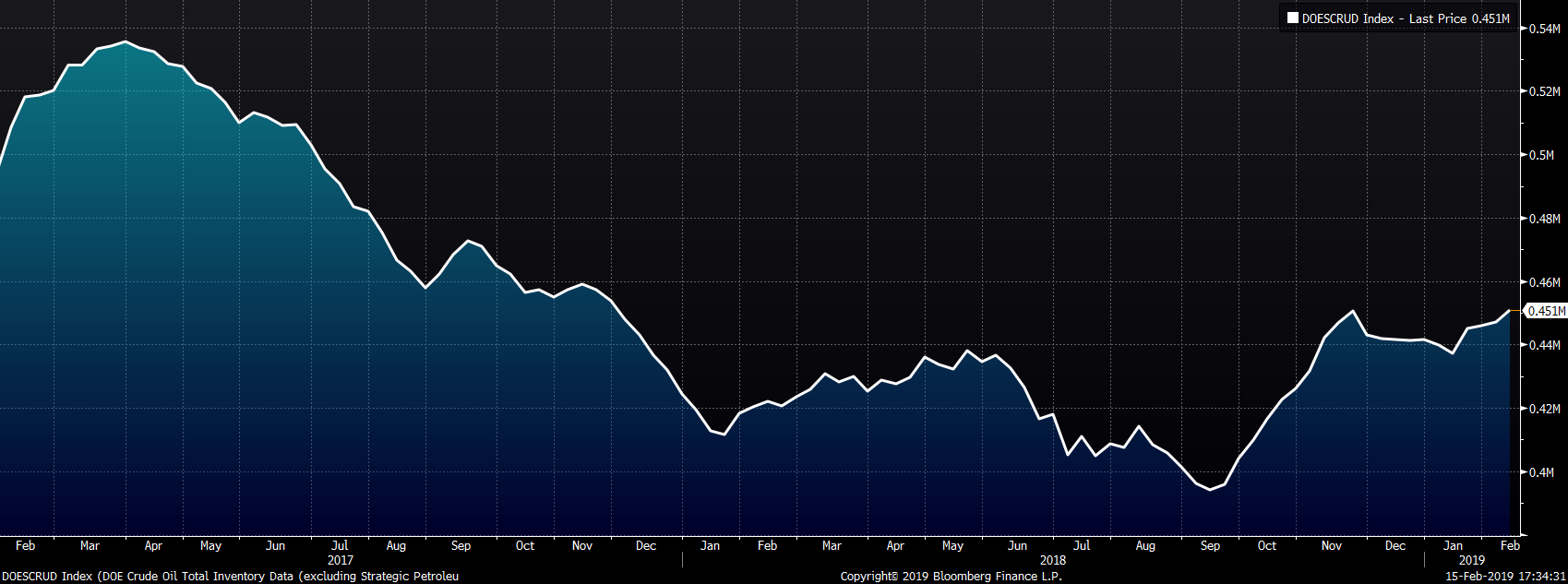 Last week, the March WTI crude oil future gained $2.87 or 5.4% to $55.59/bbl. Crude oil inventory was up 0.8% while distillate and gasoline inventories rose 0.9% and 0.2%, respectively. The aggregate inventory level rose 0.6%. Crude oil production remains at 11.9m bbl/day. The U.S. rig count added 2 rigs, while the North American rig count lost 13 rigs. The March natural gas future gained $0.04 or 1.6% to $2.63/mmBtu. Natural gas inventory fell 4%.