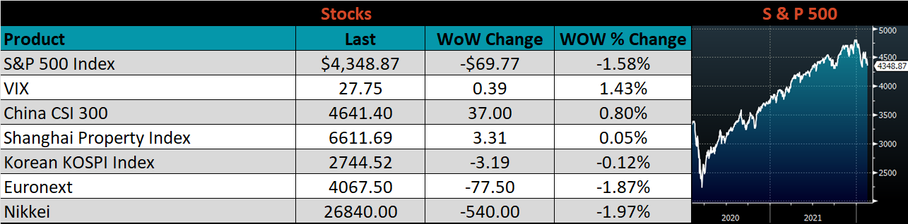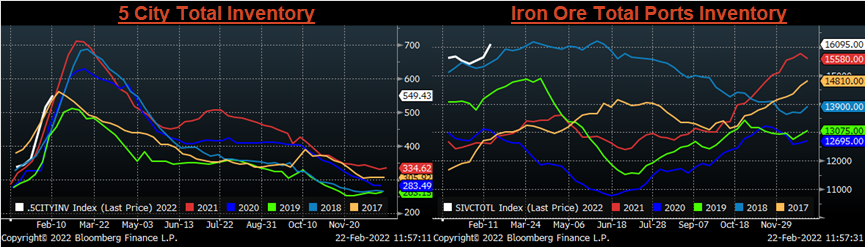 Below is the iron ore future curve with Friday’s settlements in orange, and the prior week’s settlements in green. Last week, the entire curve sold off sharply, most significantly in the March expiration.