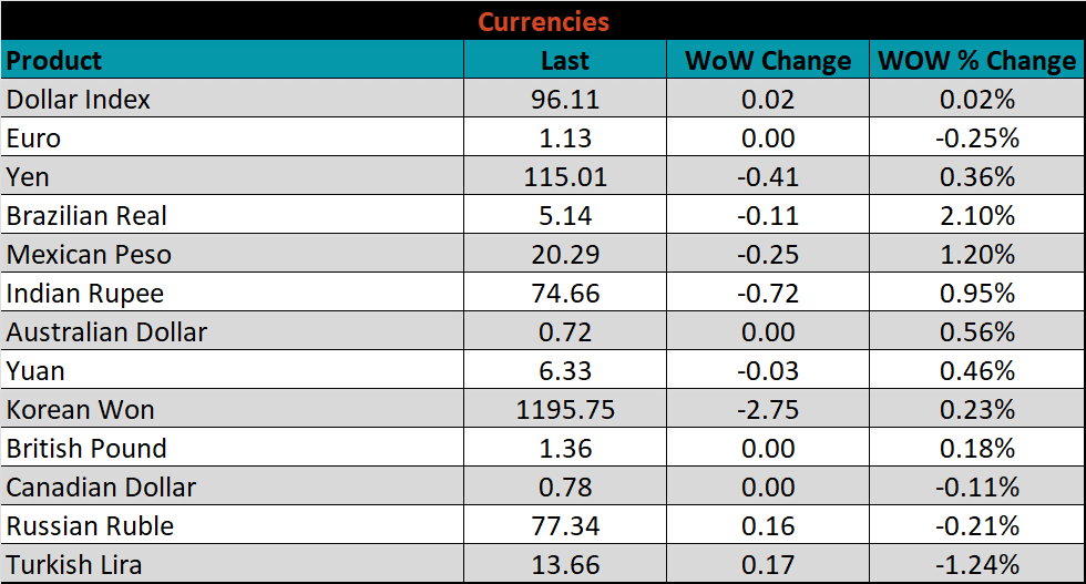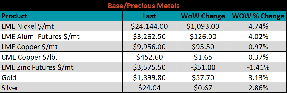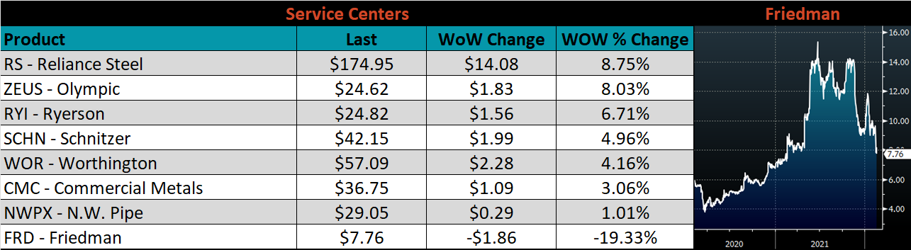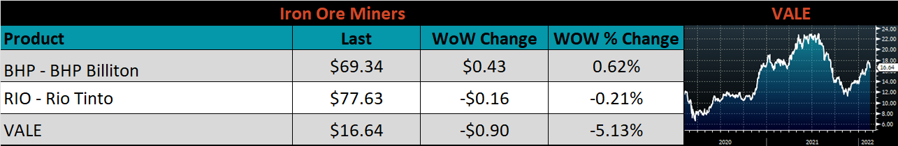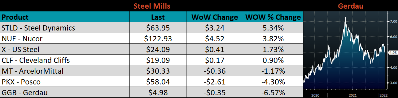 SBB Platt’s HRC, CRC and HDG pricing is below. The Midwest HRC, CRC, and HDG prices were down 7.1%, 6.1%, and 5.9%, respectively. Outside of the U.S., the Brazilian domestic HRC price was up, 3.6%.