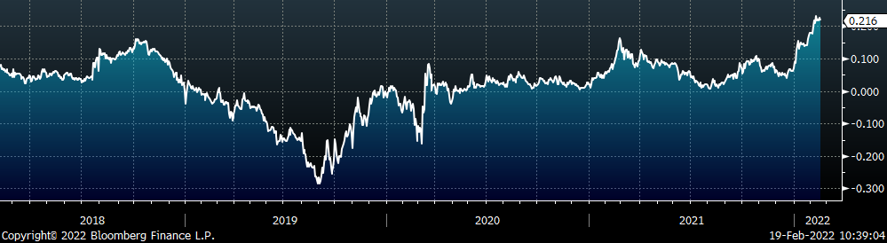 We continue to reference global strength in pricing, and the chart below shows the 3rd month HRC future (currently April) minus current global export prices.