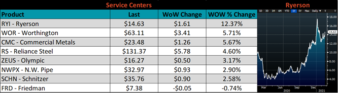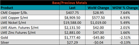 SBB Platt’s HRC, CRC and HDG pricing is below. The Midwest CRC and HDG prices were up 2.8% and 0.9%, respectively, while the HRC price was essentially flat. Globally, the East Asian HRC import price was up, 6.4%.