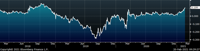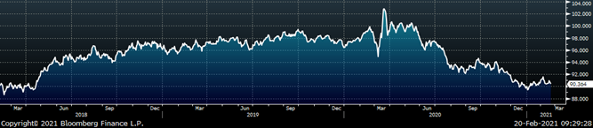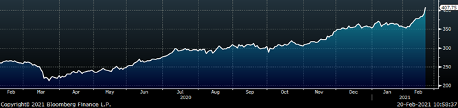Freezing temperatures across the Southern U.S. wreaked havoc on the energy and transportation infrastructure needed to produce oil and gas, causing increased demand for power and heat that was not available. Wells, pipelines and storage facilities became inoperable, compounding the effects of the undersupplied energy market. While the crisis from this weather is hopefully a short-term, temporary incident, this is not dissimilar from the broad factors driving the steel market recently – elevated demand at a time when supply and production are limited. We have also seen the same dynamics, and commented on them in this report, across multiple other industries and commodity products. The below chart shows the Platts TSI Midwest HRC price in white and the front month rolling WTI Crude Oil future in orange.
