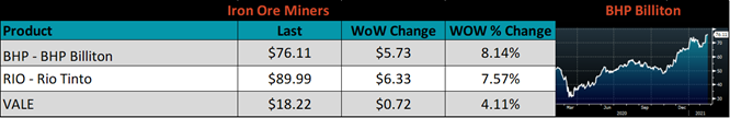 Raw material prices were mostly higher, led by iron ore futures, which gained another 4.1%, while Aussie coking coal was down another 1.4%.
