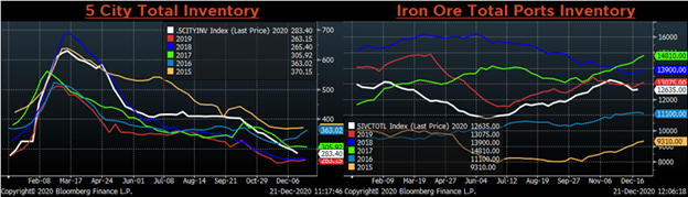 Below is the iron ore future curve with Friday’s settlements in orange, and the prior week’s settlements in green. Last week, the curve shifted lower across all expirations.