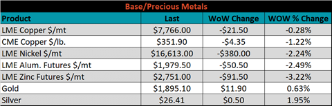 SBB Platt’s HRC, CRC and HDG pricing is below. The Midwest HDG, CRC and HRC prices were up 2%, 1.1% and 1%, respectively. Globally, the Japanese domestic HRC price was up 15.3%, while the East Asian HRC Import price was down 4.7%.