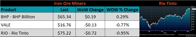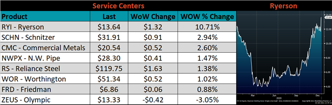 Raw material prices were mostly higher. Midwest shredded was up 10.2%, while February iron ore futures were down 2.8%.