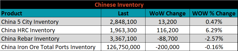 The CME Midwest HRC futures curve is below with last Friday’s settlements in white. Last week, the curve did not change.