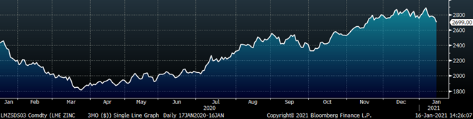 Below are inventory levels for Chinese finished steel products and iron ore. HRC and rebar inventories have started rising in line with seasonal expectations as colder weather halts construction activity. Iron ore port inventory remains near last year’s level, while prices remain over $170 per ton after a year of extraordinary demand from Chinese producers.