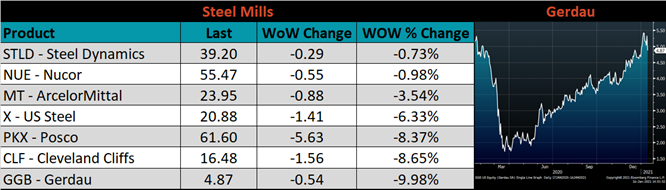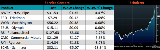 SBB Platt’s HRC, CRC and HDG pricing is below. The Midwest HDG, CRC and HRC prices were up 7.9%, 7.9% and 4.9%, respectively. Globally, the Russian Export HRC and CRC prices were up 14.9% and 14.8%, respectively.