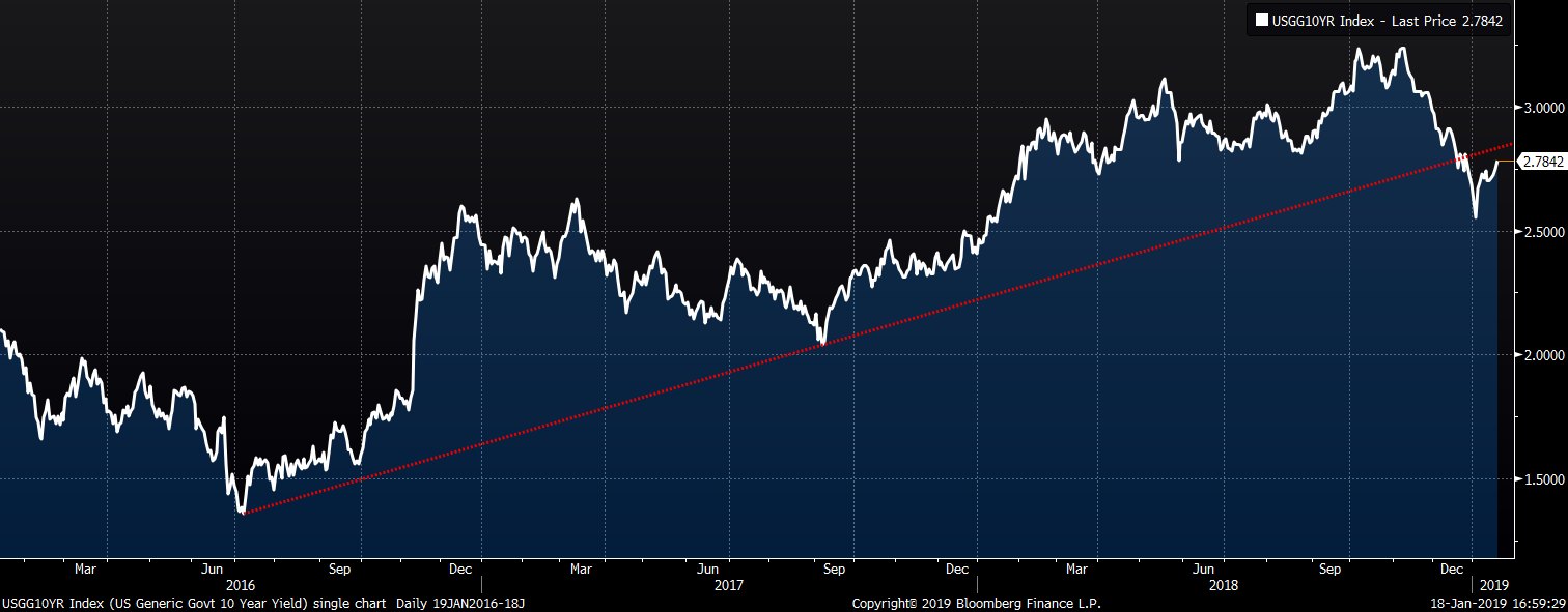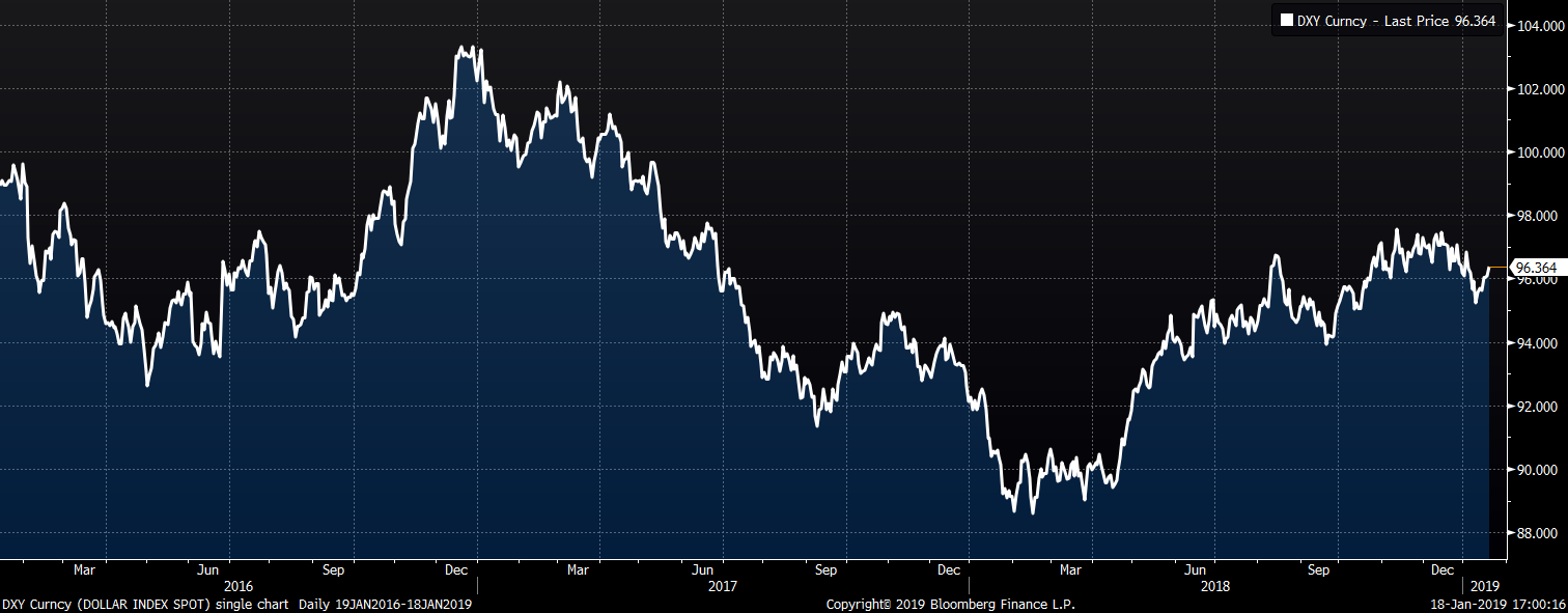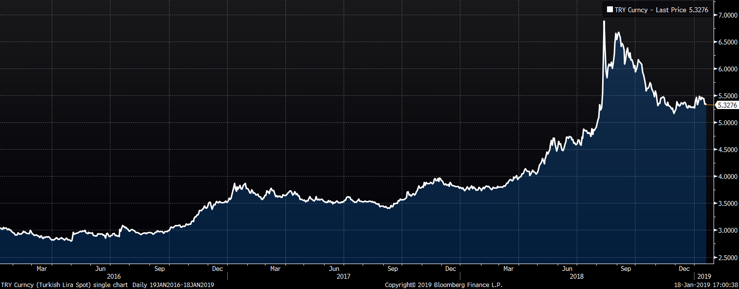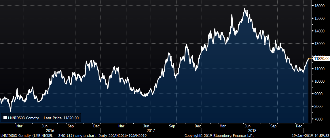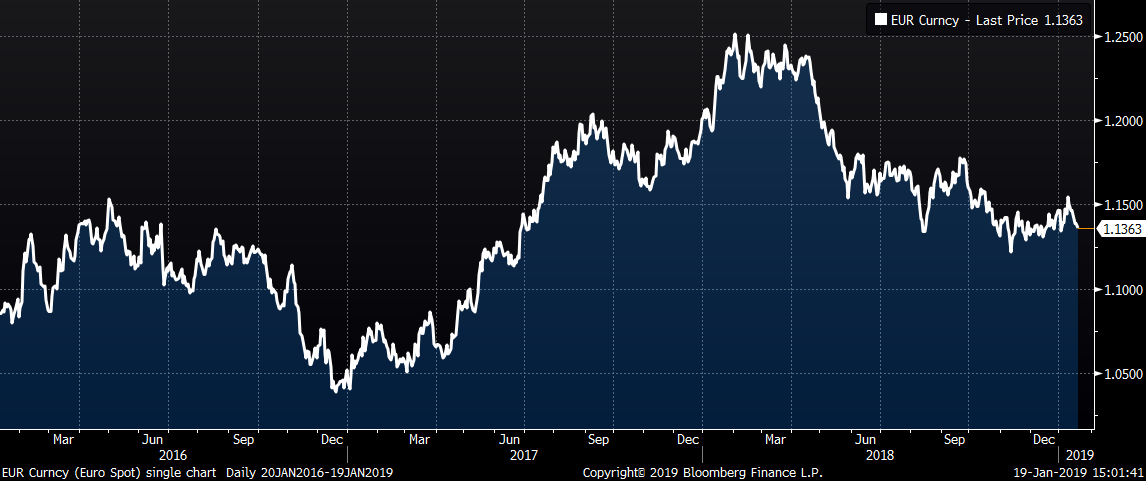 The February WTI crude oil future gained $2.21 or 4.3% to $53.80/bbl. Crude oil inventory was down 0.6%, while gasoline and distillate inventory added 3% and 2.1%, respectively. The aggregate inventory level was up 0.9% to its highest level since late 2017. Crude oil production rose to 11.9m bbl/day. The U.S. rig count decreased by twenty-five, while the North American rig count was unchanged. The February natural gas future rose $0.38 or 12.4% to $3.48/mmBtu. Natural gas inventory fell 3.1%.