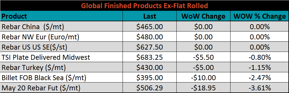 The global flat rolled indexes were mixed. TSI Antwerp HRC was up 1.7%, while Chinese spot HRC was down 1.2%.