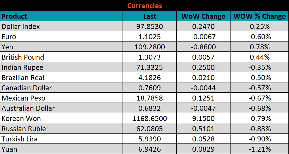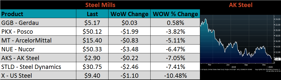 Below is the Midwest HRC price vs. each listed country’s export price using pricing from SBB Platts. We have adjusted each export price to include any tariff or transportation cost to get a comparable delivered price. All the differentials were slightly lower this week.