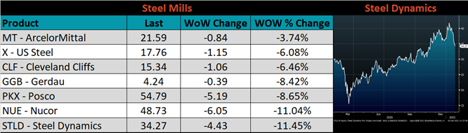 The CME Midwest HRC futures curve is below with last Friday’s settlements in white. Last week, the curve shifted higher in the front months and slightly lower in the back.