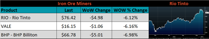 Below is the iron ore future curve with Friday’s settlements in orange, and the prior week’s settlements in green. Last week, the entire curve shifted significantly lower across all expirations.