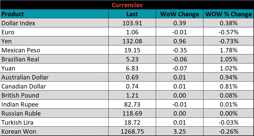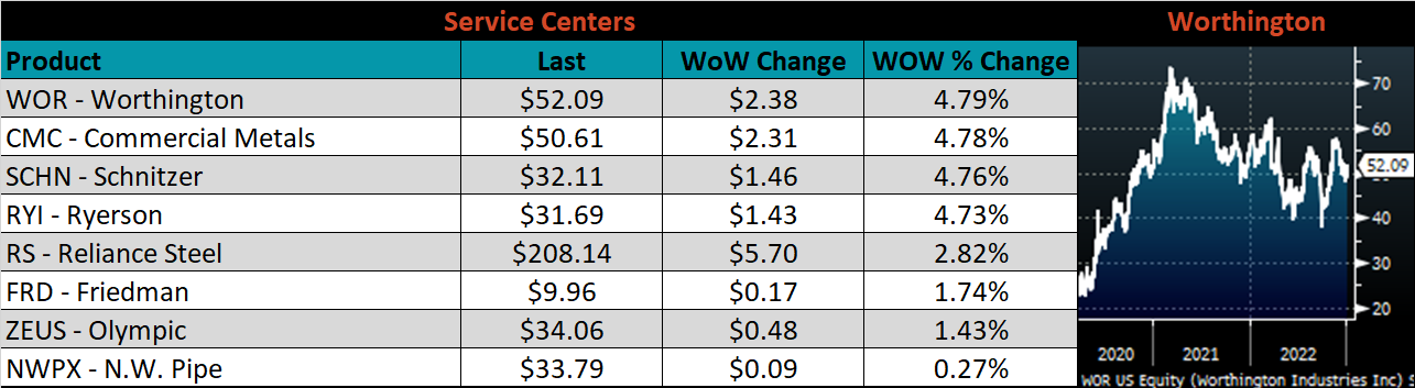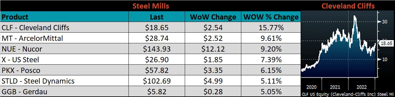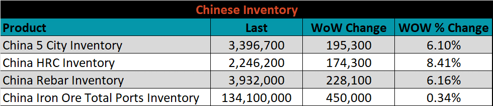Below is the Midwest HRC price vs. each listed country’s export price using pricing from SBB Platts. We have adjusted each export price to include any tariff or transportation cost to get a comparable delivered price. The differentials for Turkey and Korea were slightly lower, while the remaining countries differentials all increased.
