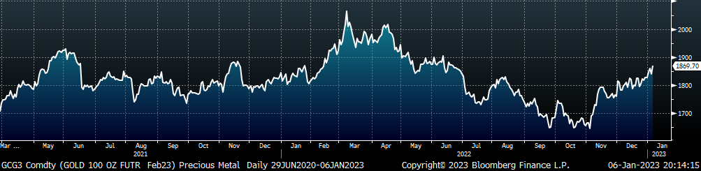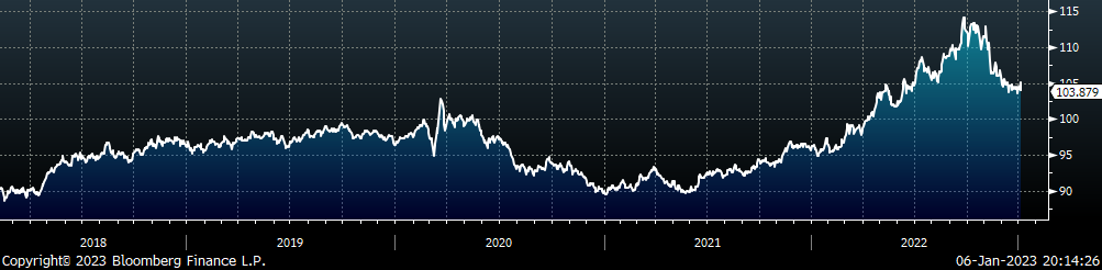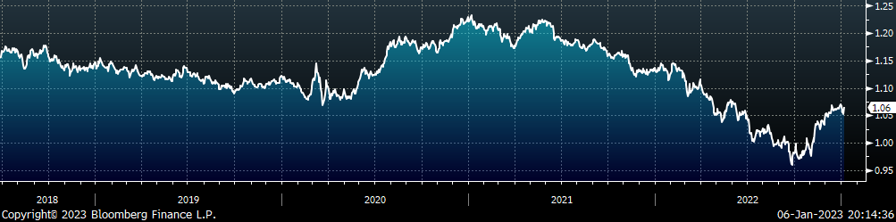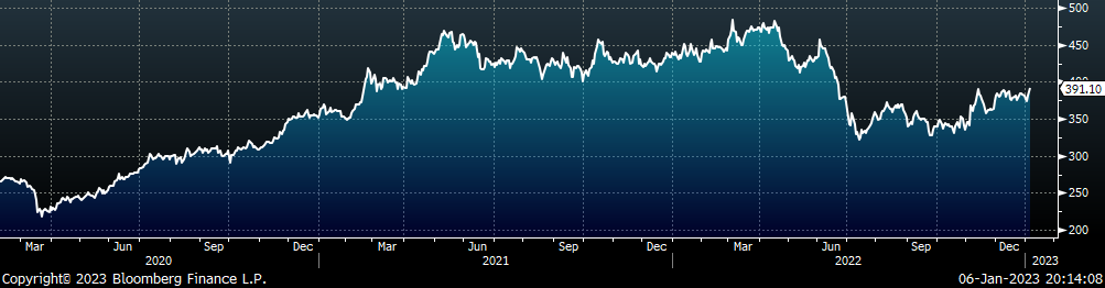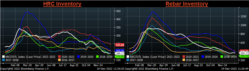 December U.S. light-vehicle sales decreased to a 13.3M seasonally adjusted annualized rate (S.A.A.R). This was the second month of decreasing sales and it is well below the 10-year average of 16.1M. The second chart shows the relationship between the unemployment rate and auto sales. The unemployment rate is inverted to show that declining unemployment typically leads to increasing auto sales. This month’s jobs report showed a labor market that continues to be remarkably resilient, with the December unemployment rate falling to 3.5%. We continue to view the gap between the two as bullish for the auto industry and expect this to bouy steel demand as construction continues to slip because of higher interest rates.