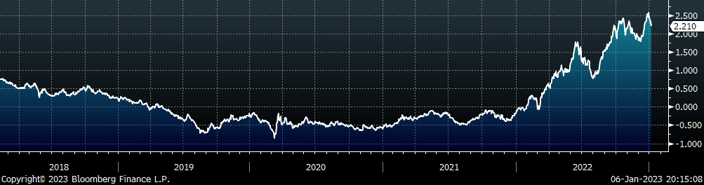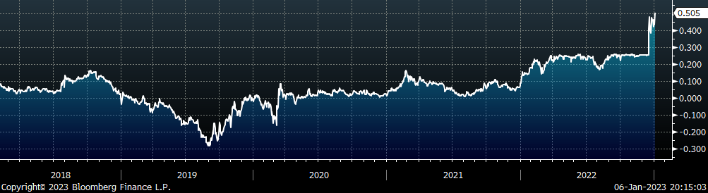 The table below breaks down China’s official manufacturing PMI subindexes. The Chinese manufacturing sector fell deeper into contraction territory. The production and expectations subindex was up significantly and moved back into expansion territory. This month’s print was impacted by the Chinese government’s removal of their covid zero policy. Skyrocketing cases have dampened short-term activity, but long-term outlook has improved.