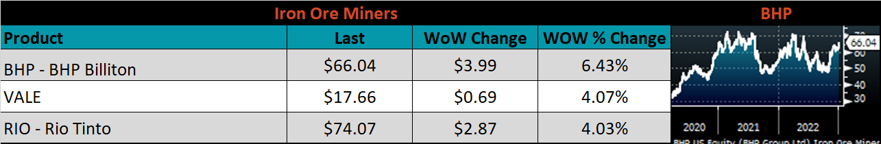 Below is the iron ore future curve with Friday’s settlements in orange, and the prior week’s settlements in green. Iron ore was up evenly across all expirations last week.