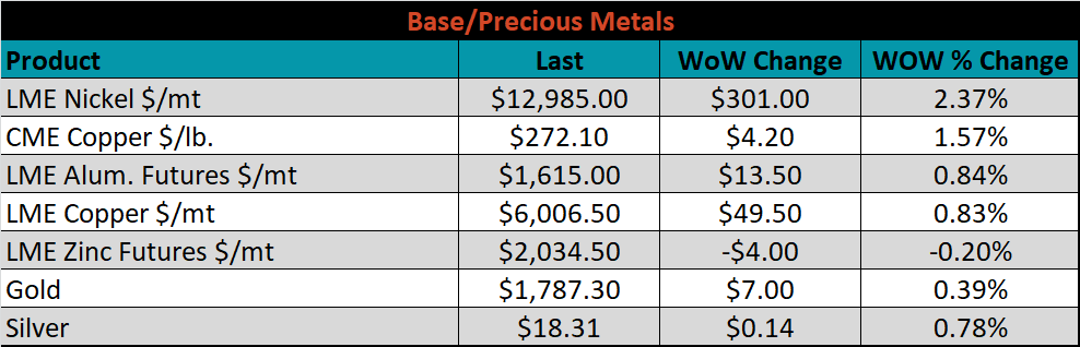 SBB Platt’s HRC, CRC and HDG pricing is below. The Midwest HRC, HDG and CRC prices were down 1.45%, 1% and 0.8%, respectively. Globally, the Turkish export HRC was down, 1.2%.