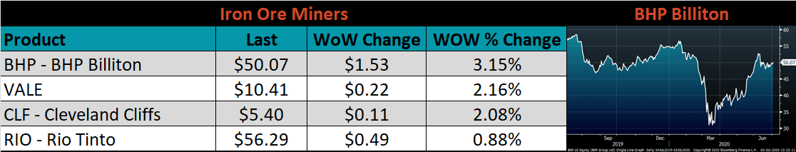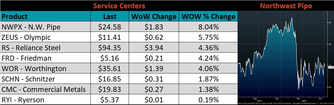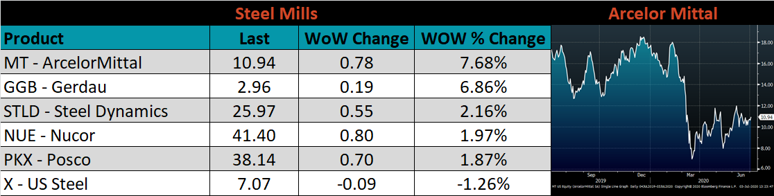Raw material prices were flat to mixed. The iron ore futures and Midwest shredded were down 3.5% and 3.1%, respectively, while Turkey HMS 75:25 was up 0.3%.