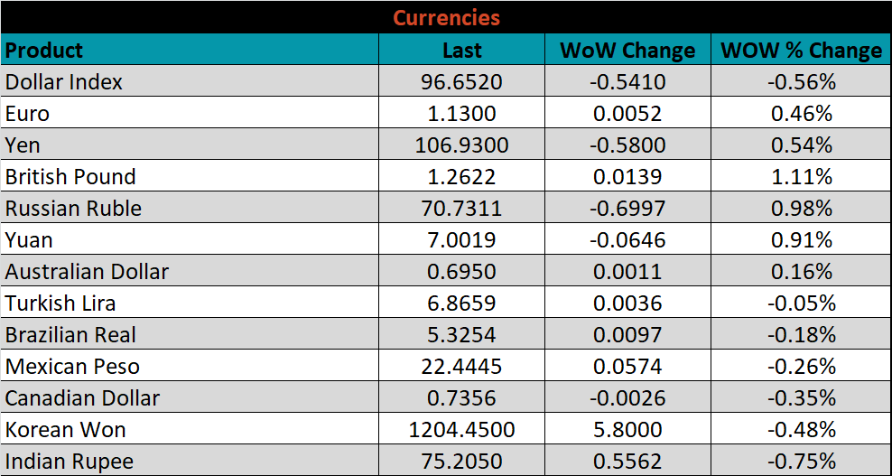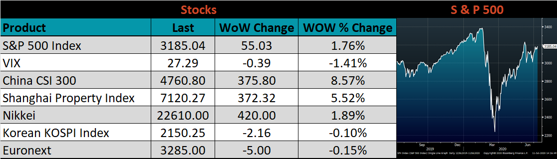 Below is the iron ore future curve with Friday’s settlements in orange, and the prior week’s settlements in green. The entire curve moved higher across all expirations, most significantly in the front.
