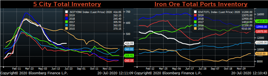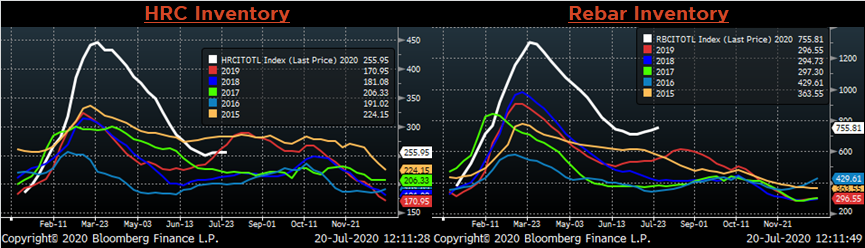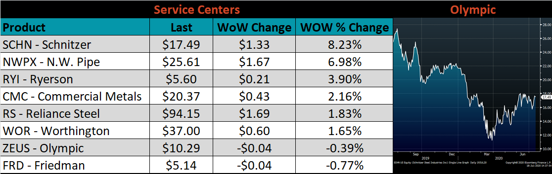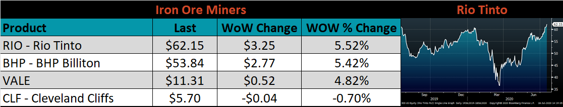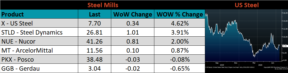 The CME Midwest HRC futures curve is below with last Friday’s settlements in white. Last week, all the 2020 expirations moved higher, led by August which jumped $20.