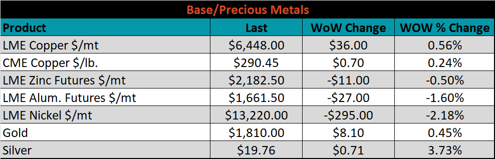 SBB Platt’s HRC, CRC and HDG pricing is below. The Midwest CRC, HDG and HRC prices were down 2.2%, 2.1% and 1.1%, respectively. Globally, the Chinese export HRC and CRC prices were up, 3.6% and 2.4%, respectively.