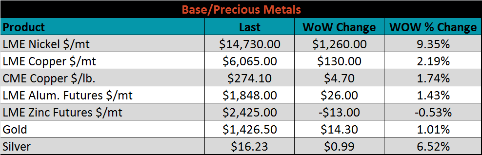 SBB Platt’s HRC, CRC and HDG pricing is below. Midwest HDG, CRC and HRC were all higher on the week, up 5.1%, 2.5% and 0.5%, respectively. Southern European HRC and HDG prices were down 4.4% and 2.3%, respectively.