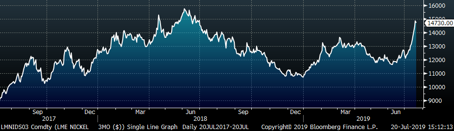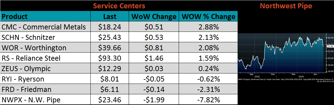 Raw material prices were mixed with the IODEX up 2.8%, and coking coal down 3.3%. The Baltic Dry Index has increased significantly over the last few months due to restarted mining in Brazil by Vale following the Brumadinho dam disaster in January. Therefore, increases in this index don’t necessarily indicate improving global demand.